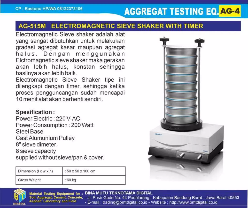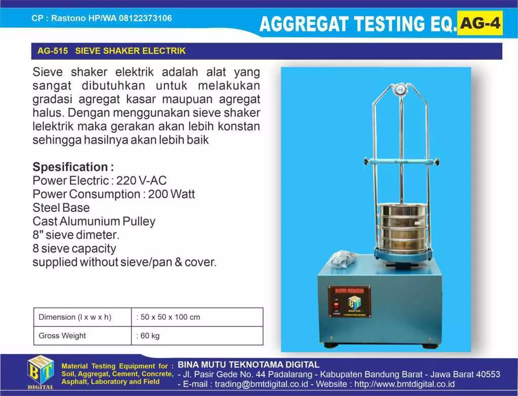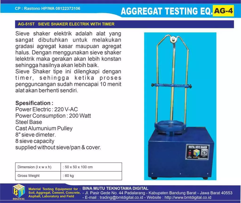 - AG-515T SIEVE SHAKER ELECTRIC WITH TIMER : yaitu alat Sieve Shaker yang menggunakan tenaga listrik sebagai sumber tenaga pengguncang dan dilengkapi dengan alat Timer Otomatis, selain proses pengguncangan agregat akan lebih stabil dan pada saat waktu mencapai 10 menit maka mesin akan mati dengan sendirinya.