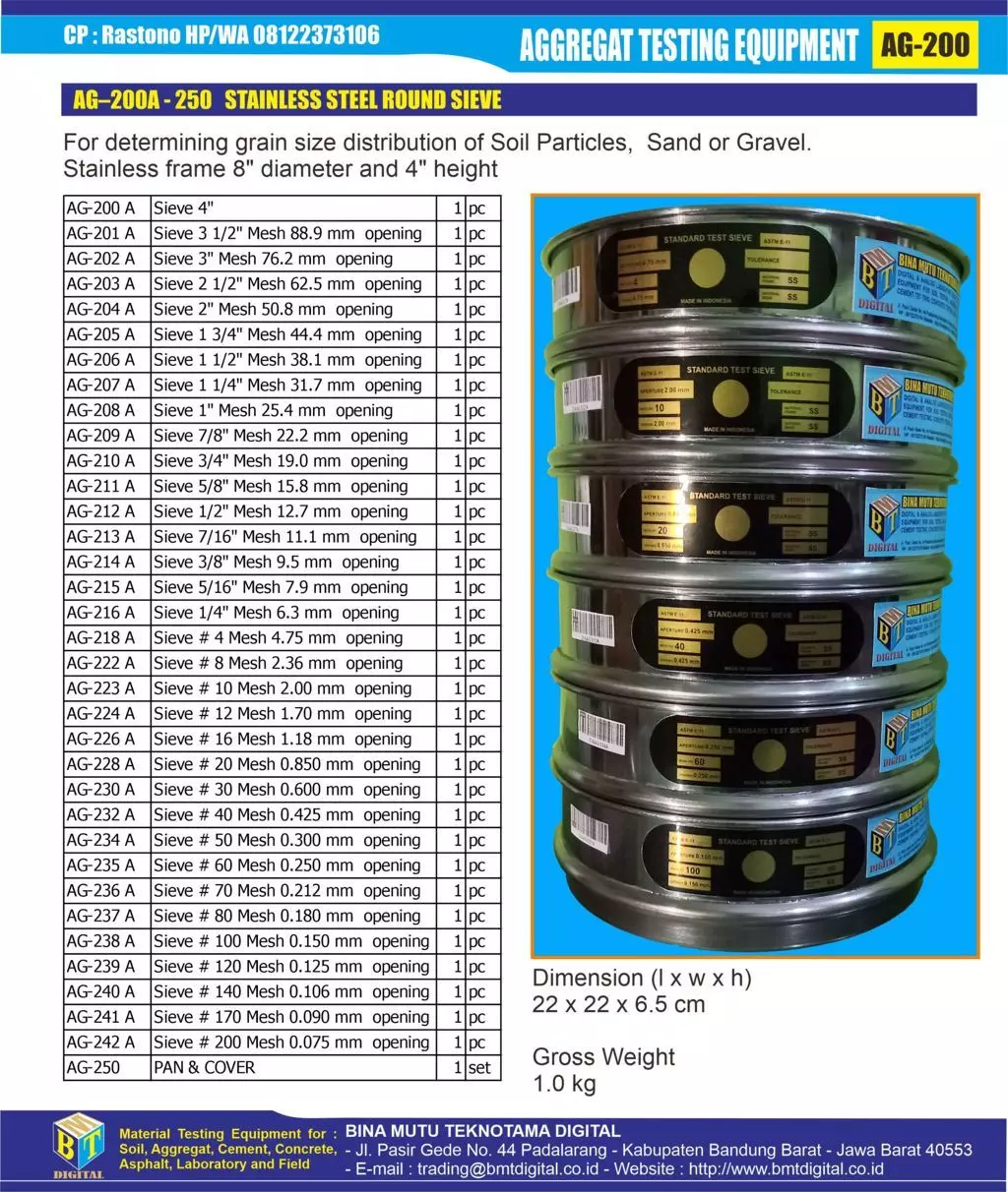 Round Sieve / Saringan adalah alat yang akan digunakan untuk melakukan Analisa Saring baik agregat kasar maupun agregat halus sehingga diketahui Gradasi / Susunan Butir Agregat tersebut. Analisa Saring digunakan untuk mengetahui ukuran butir dan gradasi agregat dari yang kasar sampai halus untuk keperluan design campuran beton / rancangan campuran hot mix. Saringan berukuran 8" diameter dan 4" tinggi.