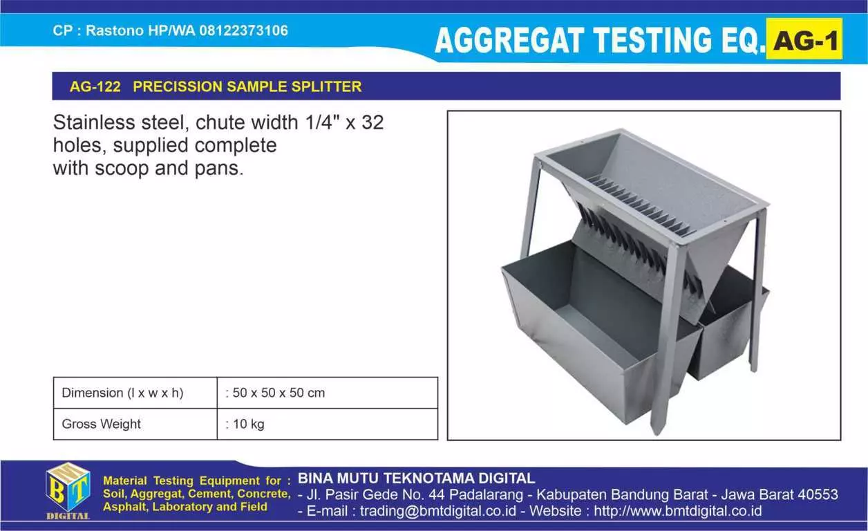 PRECISSION SAMPLE SPLITTER adalah alat pembagi agregat halus, dimana diameter lubangnya berukuran 1/4", sedangkan jumlah lubangnya ada 2 type, yaitu :