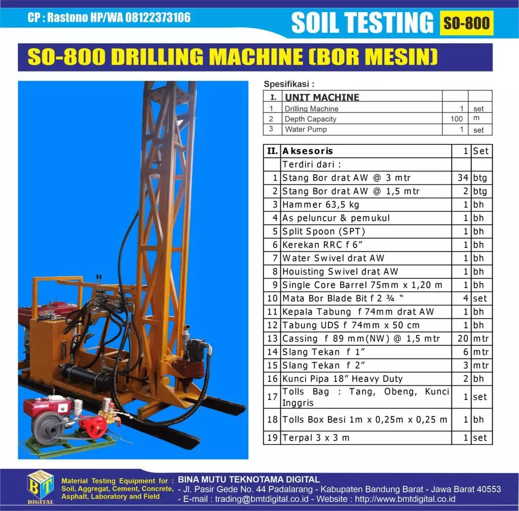 Bor mesin dengan kemampuan pengeboran sampai kedalaman 100 meter, digunakan untuk melakukan penyelidikan tanah untuk daerah yang memiliki tanah keras sangat dalam yang tidak bisa dilakukan oleh Sondir Ringan, Sondir Berat maupun Sondir Hidrolik. Mesin Bor buatan Bina Mutu Teknotama Digital dilengkapi dengan SPT Otomatis sehingga dalam 1 alat terdapat 2 fungsi yaitu pengeboran dan Pengujian Kekerasan Tanah dengan SPT. Untuk Bor mesin ini ada 2 varian yaitu :