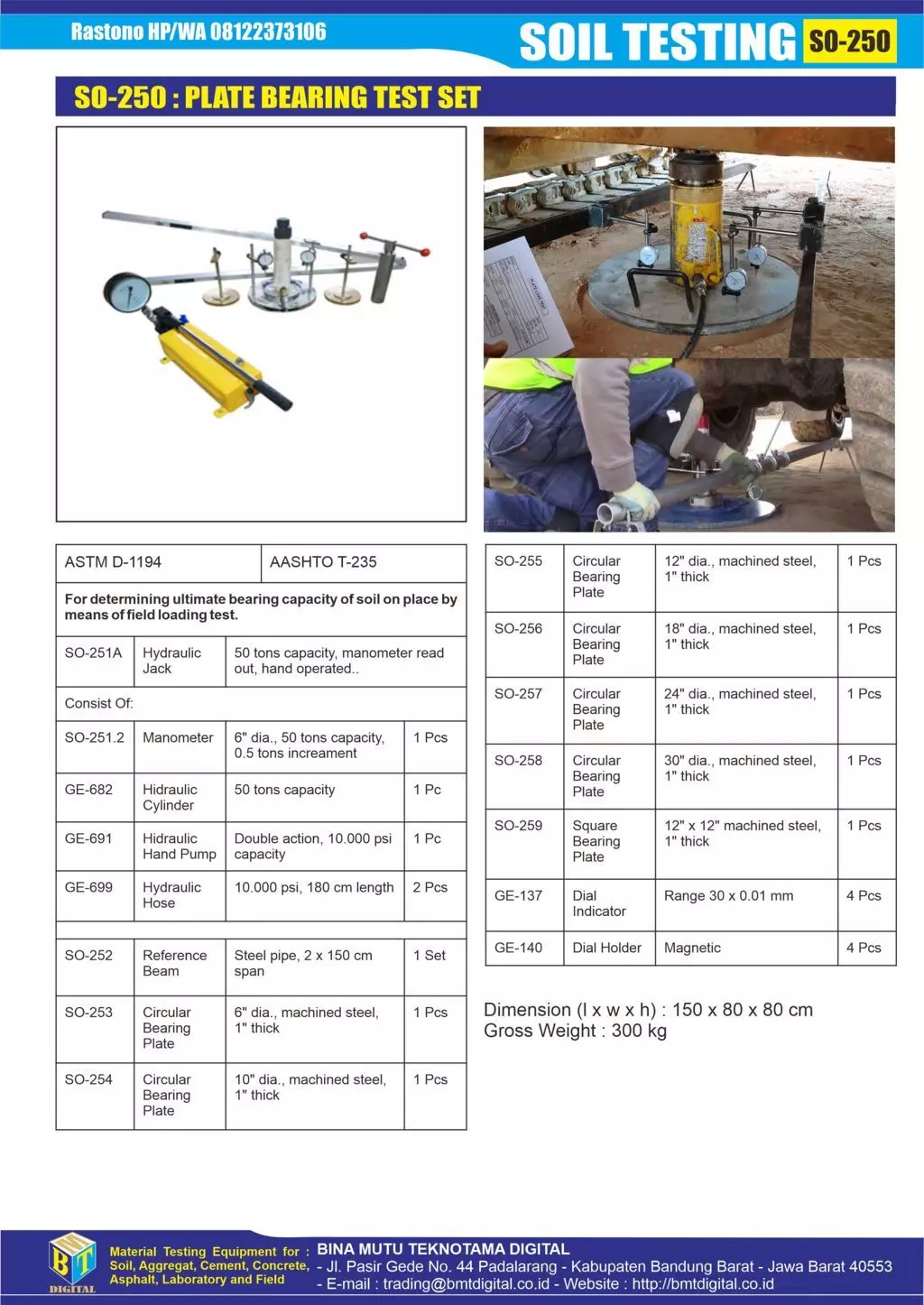 SO-250 Plate Bearing Test produk Bina Mutu Teknotama Digital didesain secara khusus, menggunakan bahan-bahan pilihan, Jack Hydraulic Enerpack, dan Dial yang telah dikalibrasi oleh KAN. Sehingga alat tersebut siap digunakan di lapangan dan menghasilkan data yang akurat.